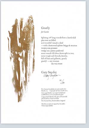 (See below for our two earlier Gary Snyder broadsides (published 1984 and 1996), a few copies of which are available again thanks to the discovery of a forgotten cache.)