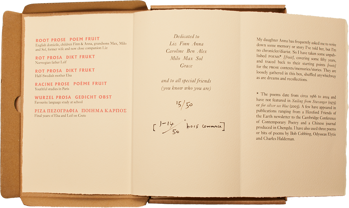 * The poems date from circa 1966 to 2024 and have not featured in Sailing from Stavanger (1975) or for silver see blue (2003). A few have appeared in publications ranging from a Hereford Friends of the Earth newsletter to the Cambridge Conference of Contemporary Poetry and a Chinese journal produced in Chengdu. I have also used three poems or bits of poems by Bob Cobbing, Odysseas Elytis and Charles Haldeman.