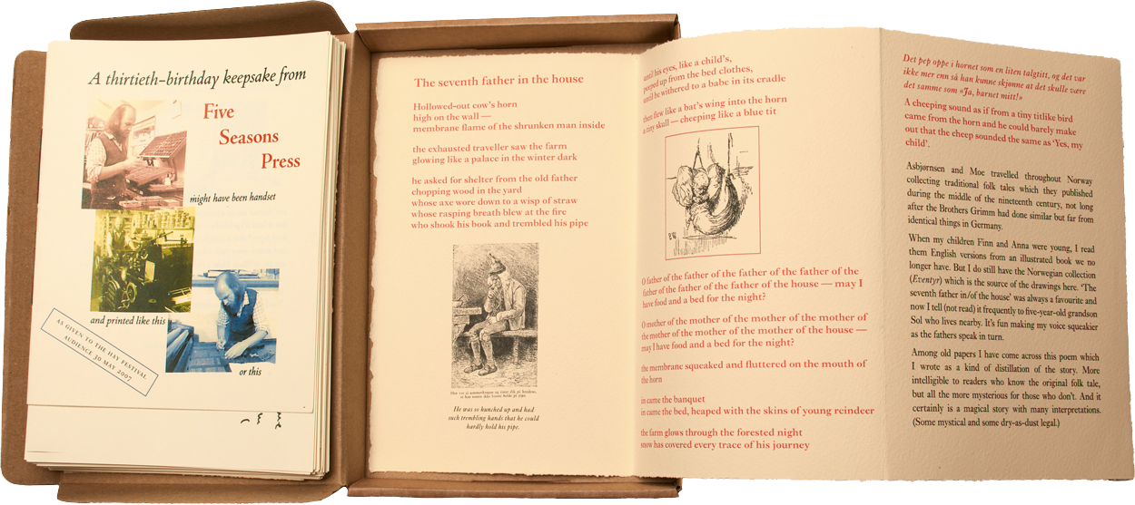A letterpress edition of 300 numbered copies published in 1996. (BFK Rives cotton paper, 570×385mm / 22.25×15in.) 20 ‘lost’ copies are now available for the first time. UK £60 inc postage. Click to enlarge